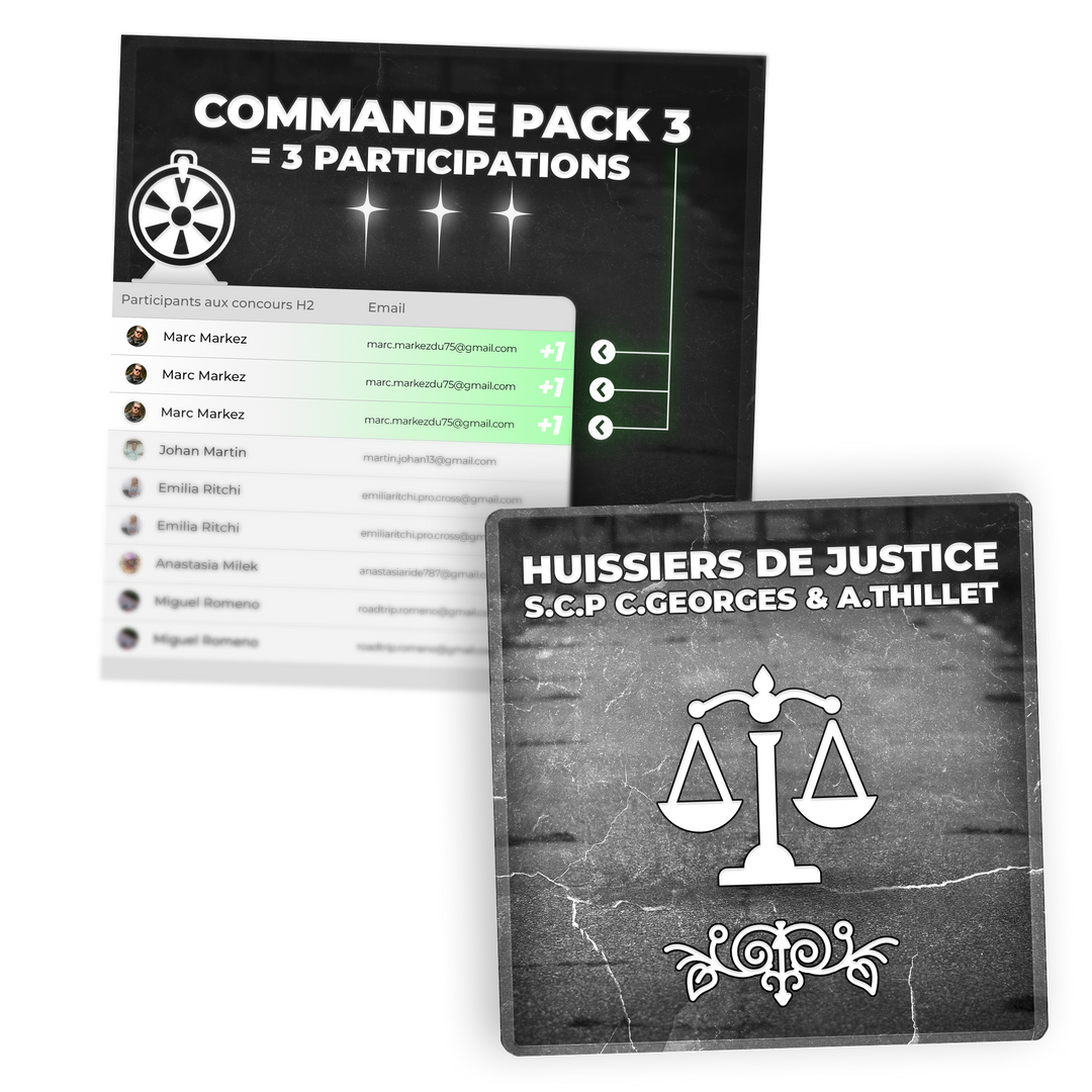 Dès lors que vous passez commande avec l'un des trois packs disponibles à la vente, un numéro commençant par # vous sera attribué, à la suite de ça, votre/vos participations sont automatiquement prises en compte pour le tirage au sort par huissier de justice qui aura lieu à la fin de la période de concours.